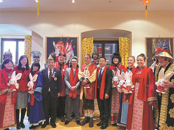 Visitors to a Chinese cultural carnival in Dietfurt, Bavaria, Germany, meet with Chinese diplomats from the Consulate General of China in Munich, on Feb 16, holding the "auspicious rabbit" toys.