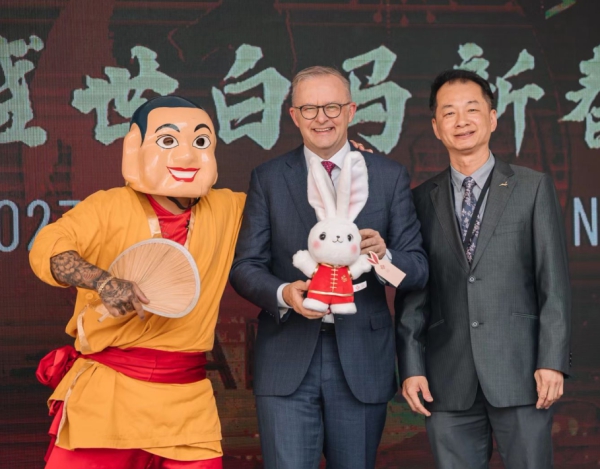 Australian Prime Minister Anthony Albanese holds the "auspicious rabbit" toy on Jan 29.
