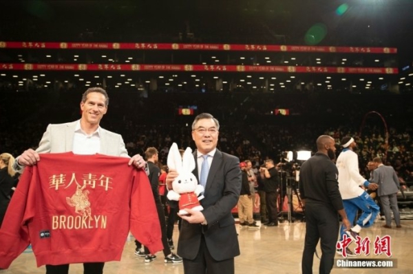 In New York, Chinese Consul General Huang Ping, participates in a pregame gift exchange with BSE Global CEO Sam Zussman, parent company of the Brooklyn Nets on Jan 26.