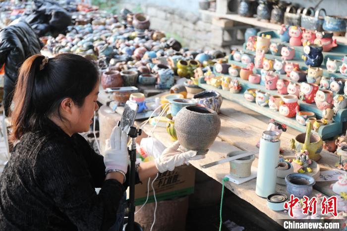 A saleswoman promotes pottery products during a livestream. (Photo/Gao Wei)