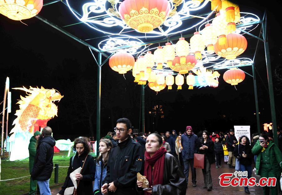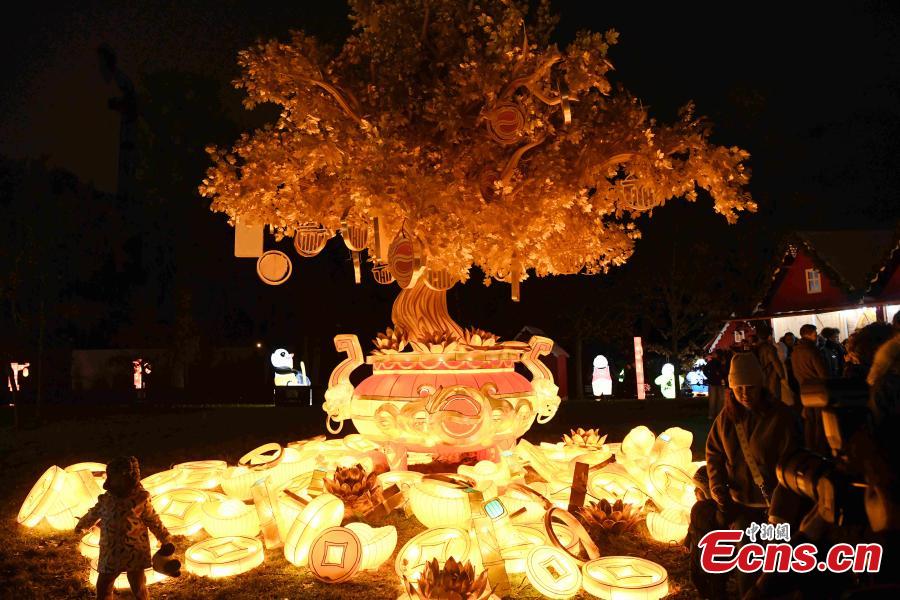 Yuyuan lanterns are illuminated during the French Yuyuan Garden Lantern Festival in Paris, France, Dec. 13, 2023. (Photo: China News Service/Li Yang)