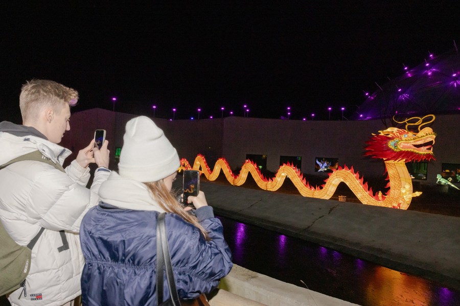 A visitor takes selfies at the Year of the Dragon Lantern Festival in Budapest Zoo in Budapest, Hungary, Dec. 16, 2023. (Photo by Attila Volgyi/Xinhua)