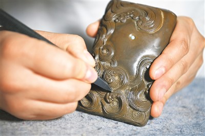 Lin Xiaolin carves on a Chengni inkstone in north China's Shanxi Province. (Xinhua/Yang Chenguang)