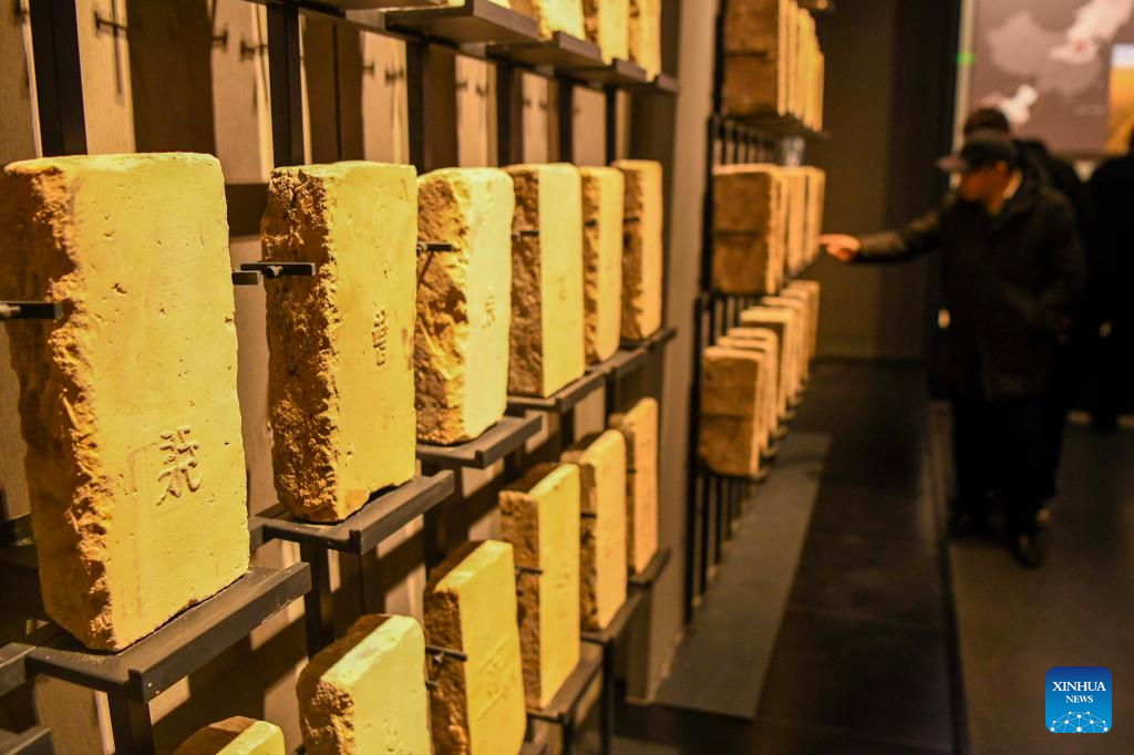 Tourists learn about the bricks for building the Great Wall at the Silk Road and Great Wall Culture Museum in Yuli County, northwest China's Xinjiang Uygur Autonomous Region, Dec. 29, 2023.