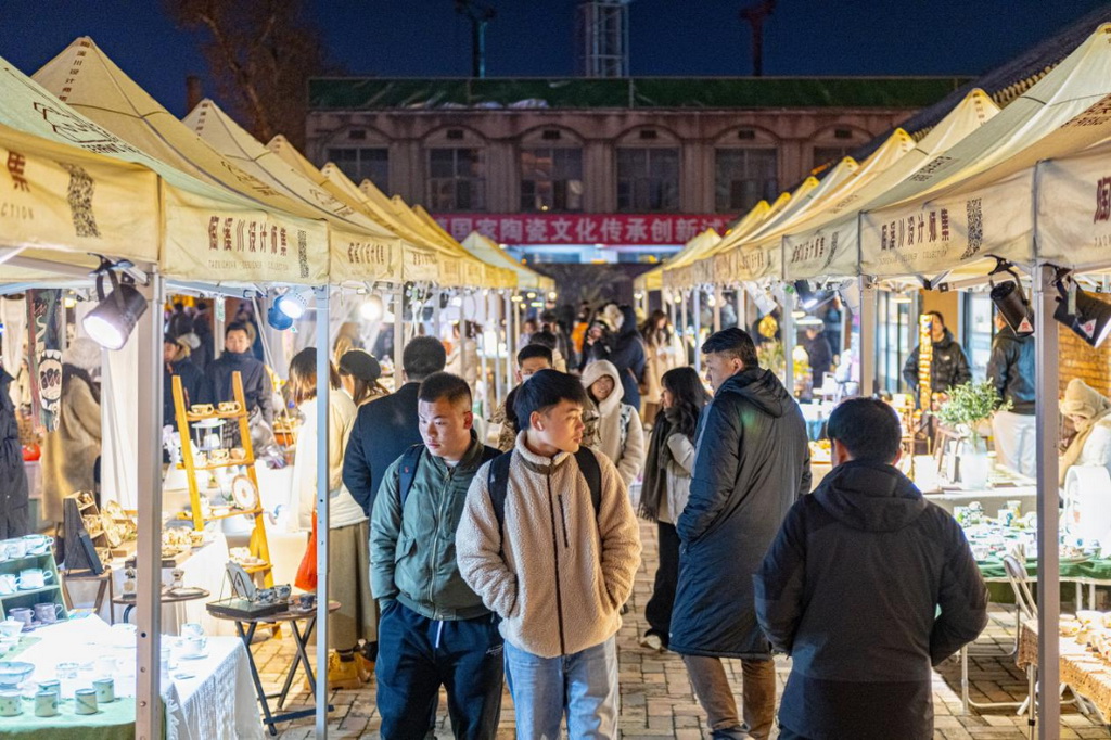 At night, an artistic atmosphere permeates Taoxichuan's cultural and creative block. The creative market attracts tourists from far and wide with its diverse collection of ceramic artworks. More than 400 booths sell handmade ceramic artworks there.