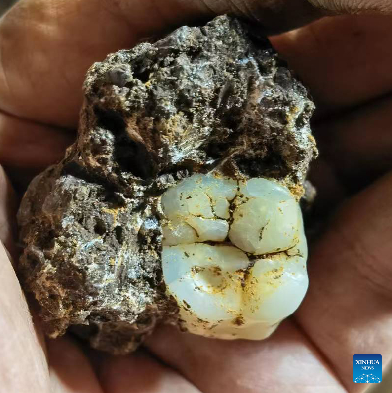 This undated file photo shows a fossilized tooth of the giant ape, Gigantopithecus blacki, excavated by scientists in south China's Guangxi Zhuang Autonomous Region. An international team of scientists from China, Australia and the United States unraveled the mystery of when and how the largest ape ever known on Earth went extinct.