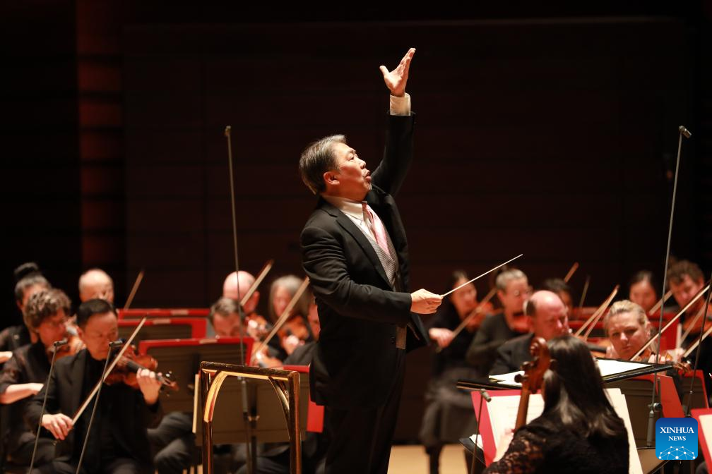 Yu Long (C), who holds senior positions at the China Philharmonic Orchestra in Beijing, the Shanghai Symphony Orchestra and the Hong Kong Philharmonic Orchestra, conducts during a concert presented by the Philadelphia Orchestra to celebrate Chinese New Year in Verizon Hall at the Kimmel Center for the Performing Arts in Philadelphia, the United States, Jan. 12, 2024. (Xinhua/Xie E)