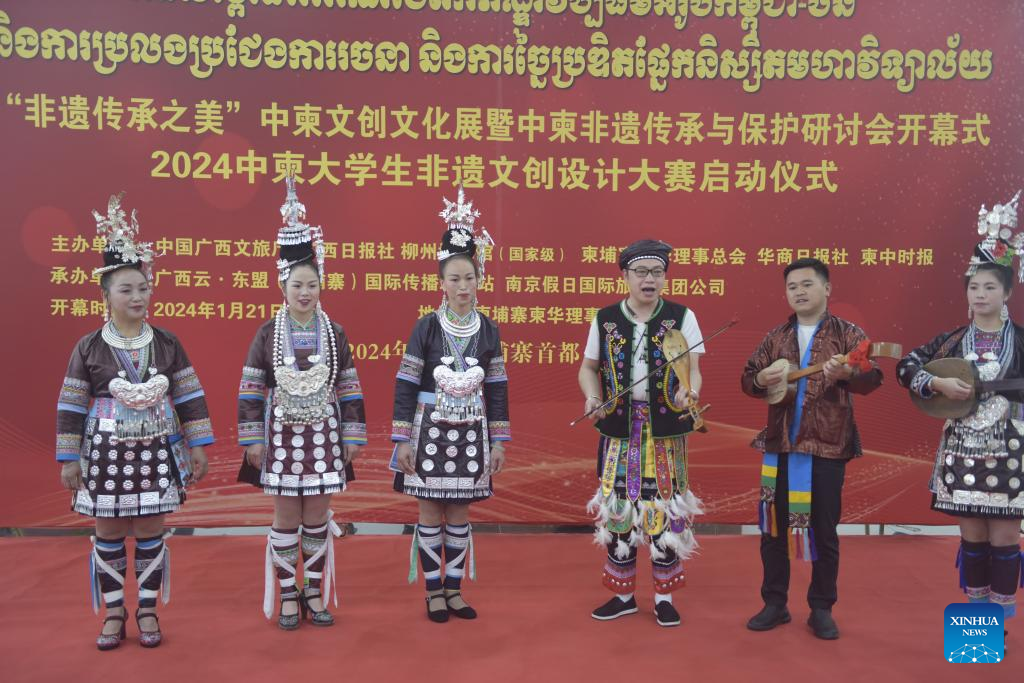 Chinese inheritors of intangible cultural heritage perform Grand Song of the Dong ethnic group in Phnom Penh, Cambodia, Jan. 21, 2024. A China-Cambodia "Beauty of Intangible Heritage" exhibition kicked off here in the Cambodian capital on Sunday, captivating hundreds of visitors. (Photo by Liao Hongqing/Xinhua)