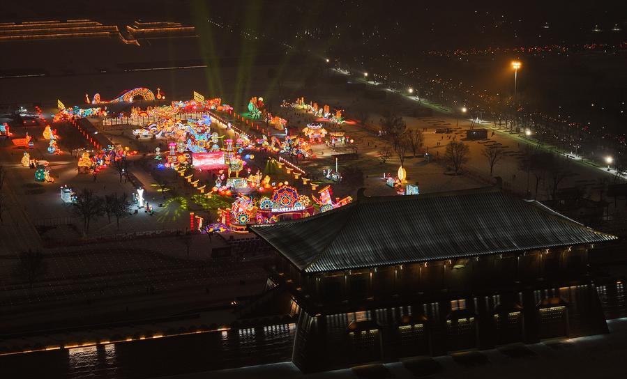 Light decorations are seen at the Daming Palace National Heritage Park in Xi'an, capital of northwest China's Shaanxi Province, Feb. 2, 2024. (Xinhua/Zhang Bowen)