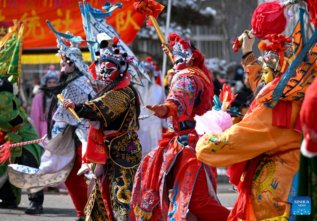 Folk artists perform during a national Shehuo competition in Guyuan, northwest China's Ningxia Hui Autonomous Region, Feb. 24, 2024. (Xinhua/Feng Kaihua)
