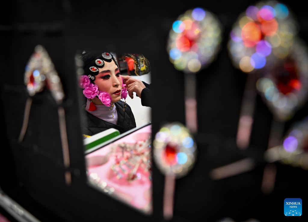 A folk artist prepares for a national Shehuo competition in Guyuan, northwest China's Ningxia Hui Autonomous Region, Feb. 24, 2024. (Xinhua/Feng Kaihua)