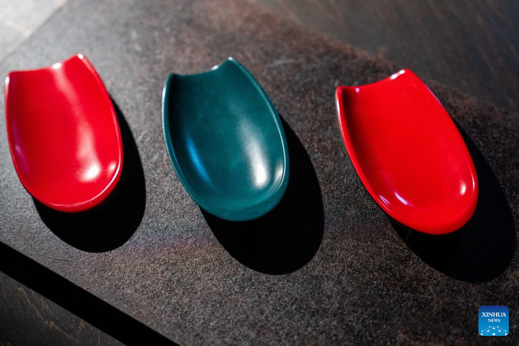Lacquer coated tea sets are displayed at Hao Guanxiong's studio in Changsha, central China's Hunan Province, Feb. 28. 2024. (Xinhua/Chen Sihan)