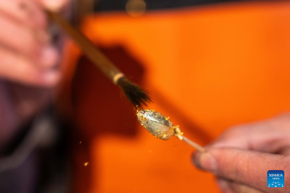 Hao Guanxiong puts a gold leaf on an artwork at his studio in Changsha, central China's Hunan Province, Feb. 28. 2024. (Xinhua/Chen Sihan)