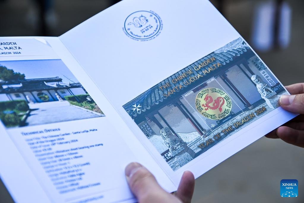 Photo taken on March 6, 2024 shows a special zodiac stamp for the Chinese Year of the Dragon in Santa Lucija, Malta. A ceremony for the issuance of a special zodiac stamp for the Chinese Year of the Dragon was held in Malta on Wednesday. It's the first time Malta has issued a Chinese zodiac stamp since the establishment of its diplomatic relations with China in 1972. (Photo by Jonathan Borg/Xinhua)