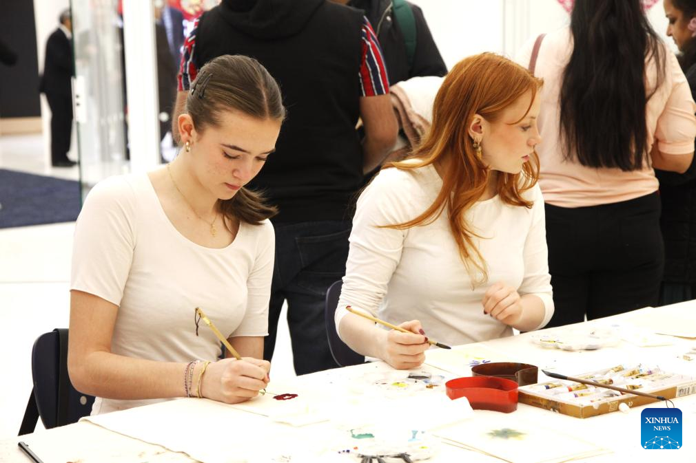 Local people practice Chinese painting in Oslo, capital of Norway, on April 20, 2024. A series of activities have been held in Norway to celebrate the United Nations Chinese Language Day, attracting a large number of participants. (Xinhua/Zhang Yuliang)