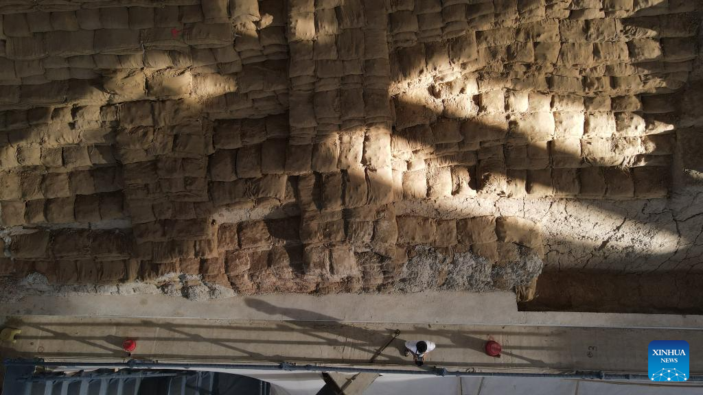 An aerial drone photo taken on May 20, 2024 shows the excavation site of the Wuwangdun tomb discovered in Huainan, east China's Anhui Province. (Xinhua/Zhang Duan)