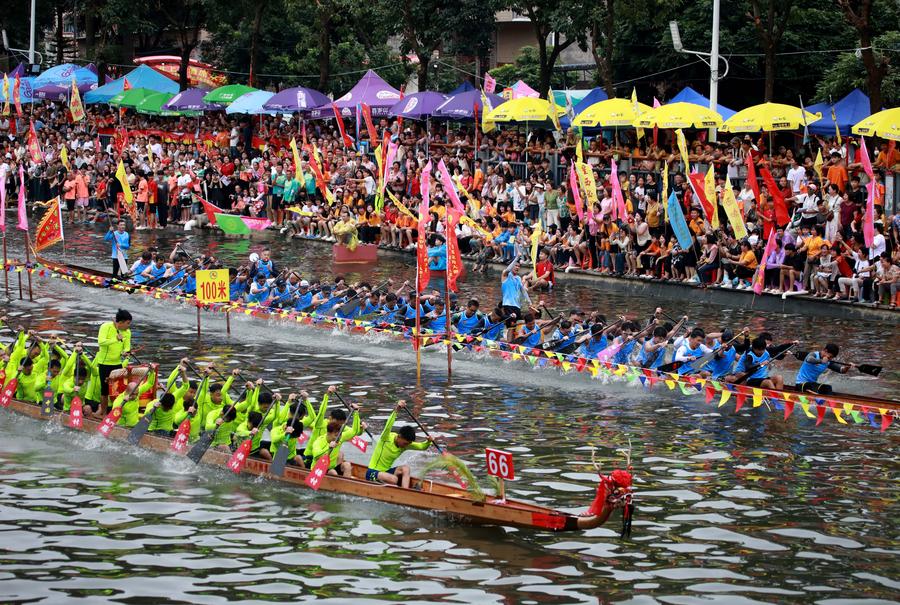 Despite the sticky weather, teams on dragon-headed vessels in south China's Guangdong Province sliced cleanly through the water once the whistle sounded. The beat of drums reverberated in the air and the audience could be heard cheering around the lake.