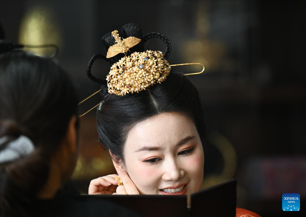 An enthusiast for Hanfu tries a head decoration of filigree mosaic at a studio in Tianjin, north China, March 7, 2024. (Xinhua/Sun Fanyue)