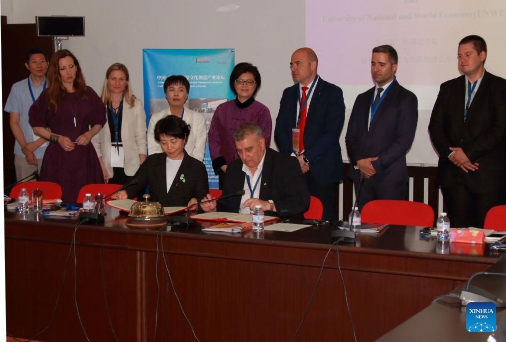 Representatives of Beijing International Studies University and Bulgaria's University of National and World Economy sign a cooperative memorandum during the 5th China-Central and Eastern European Countries Cultural and Creative Industry Forum in Sofia, Bulgaria, June 26, 2024. The forum kicked off here Wednesday, focusing on digital technology's role in cultural trade. (Photo by Marian Draganov/Xinhua)