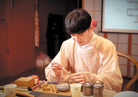 Wearing hanfu, Zhong Min-hao tries scented candles in Xiamen, Fujian province. (Photo provided to CHINA DAILY)