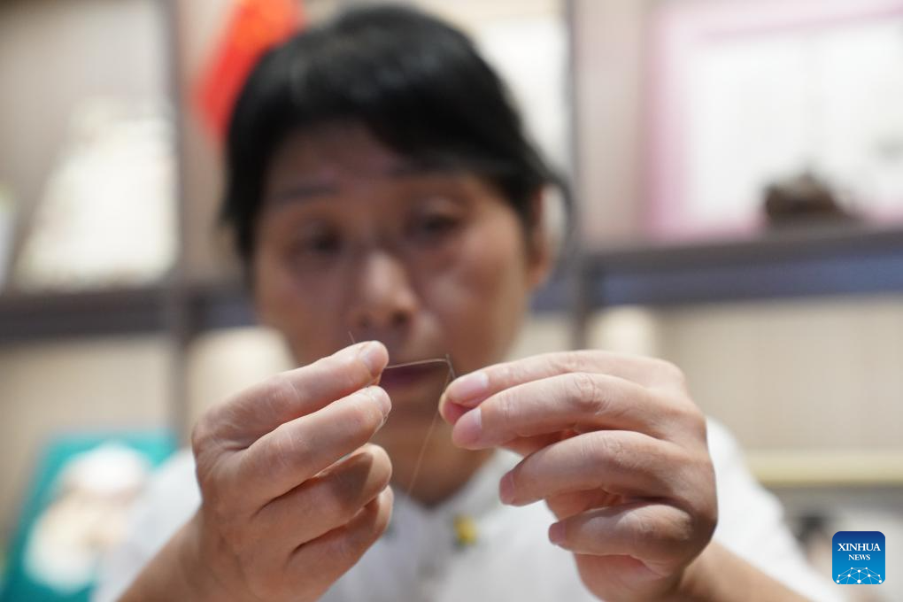 Tao Yonghong threads a hair through a needle to make Gan hair embroidery at an exhibition center for intangible cultural heritage in Nanchang, east China's Jiangxi Province, Sept. 13, 2024. (Xinhua/Zhou Mi)