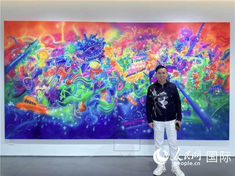 Long Tengfei, president of the Dafen Fine Arts Industry Association, poses for a picture with a painting by a young artist in Dafen village. (People's Daily Online/Sun Shuyu)