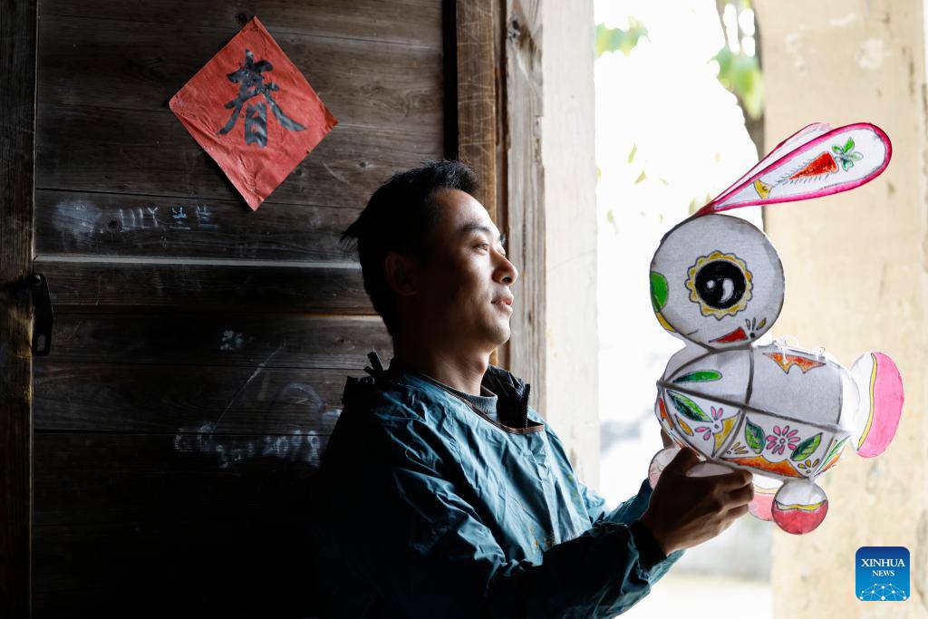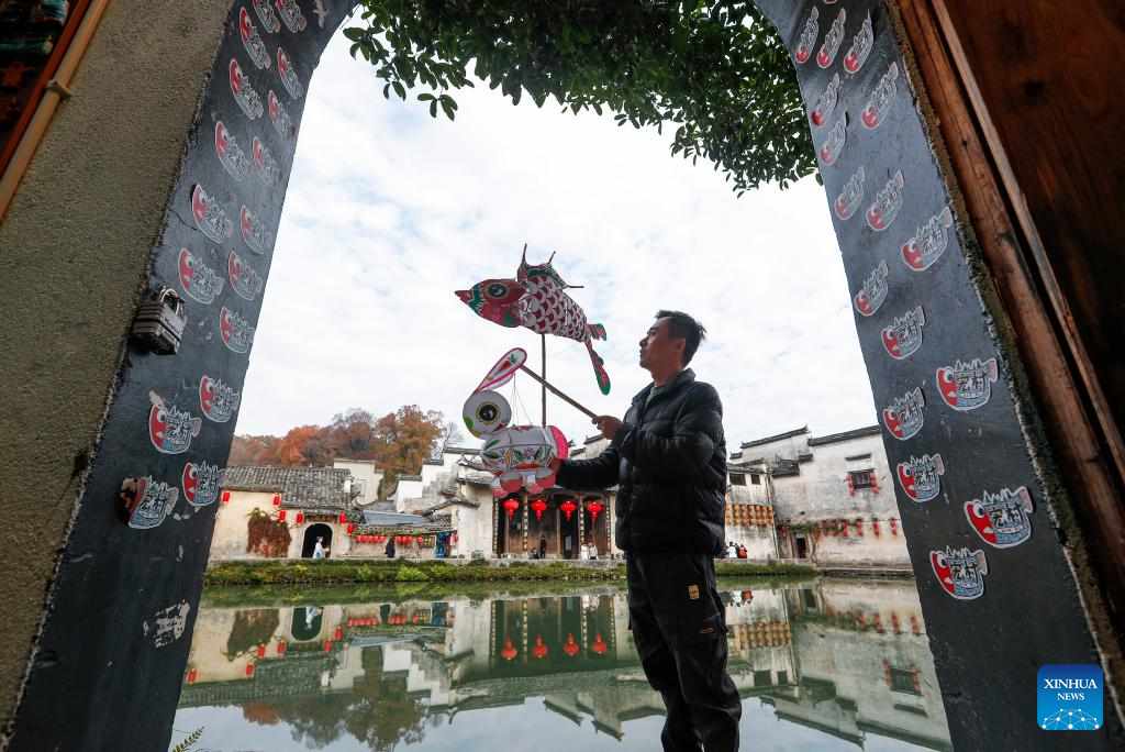 He Jixing checks a festive lantern at Hongcun Village of Yixian County, Huangshan City, east China's Anhui Province, Dec. 9, 2024. (Photo by Shi Yalei/Xinhua)