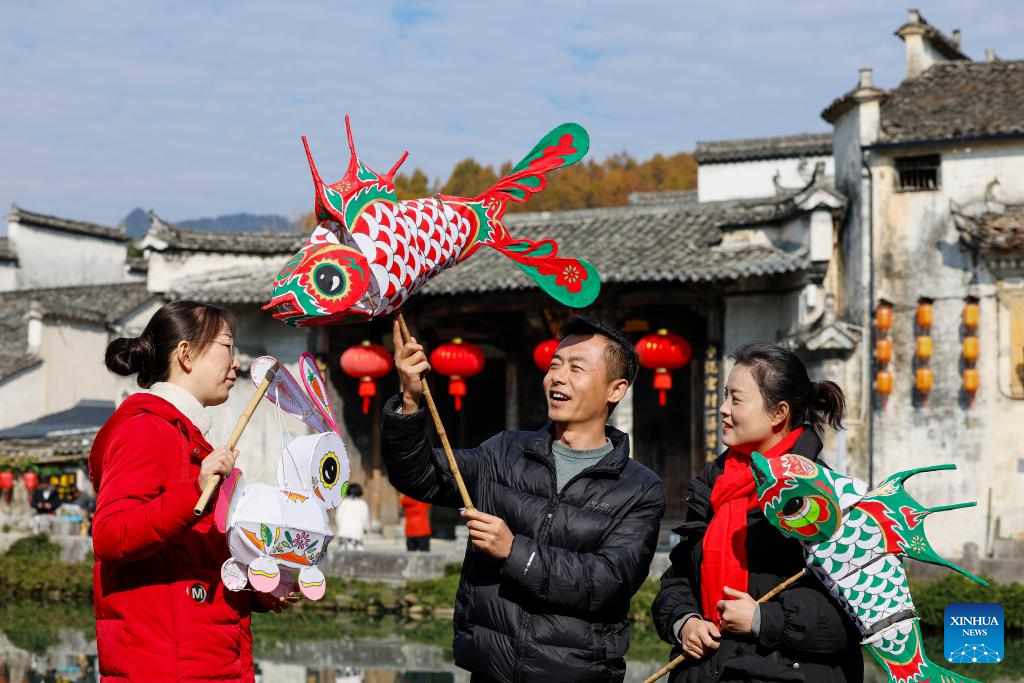 He Jixing (C) and trainees check festive lanterns at Hongcun Village of Yixian County, Huangshan City, east China's Anhui Province, Dec. 9, 2024. (Photo by Shi Yalei/Xinhua)