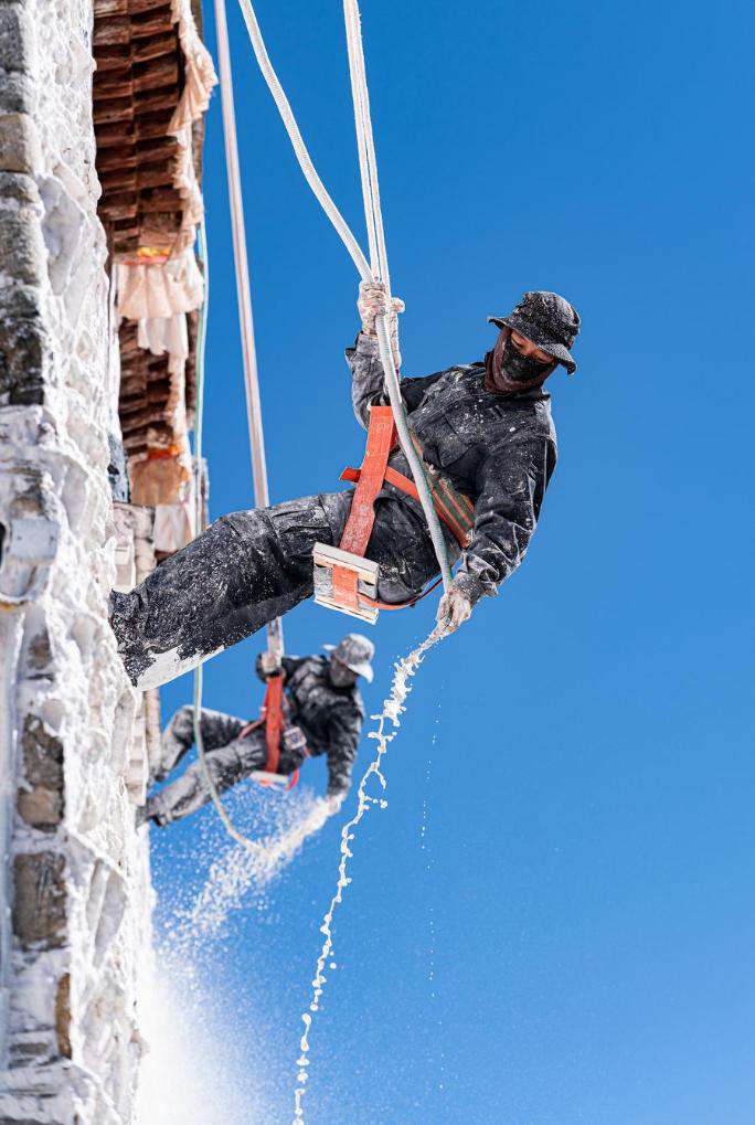 Workers paint the wall of the Potala Palace during an annual renovation of the ancient architectural complex in Lhasa, southwest China's Xizang Autonomous Region, Oct. 29, 2024. (Xinhua/Jigme Dorje)