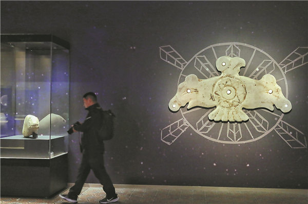 A photo of a jade eagle adorns the wall of the venue at the ongoing exhibition Vanguard of Civilization: Jade Artifacts From the Lingjiatan Culture at the Palace Museum in Beijing. (Jiang Dong/China Daily)