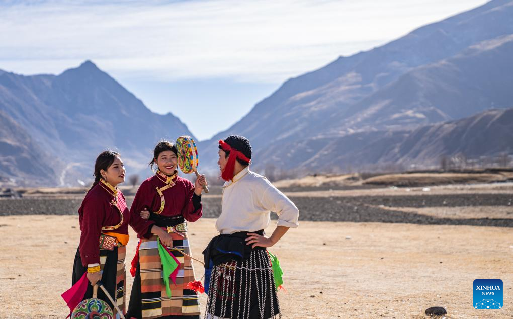 Members of a Reba Dance performing team wait for rehearsal in Chido Township, Dengqen County, Qamdo, southwest China's Xizang Autonomous Region, Jan. 5, 2025. (Xinhua/Tenzin Nyida)