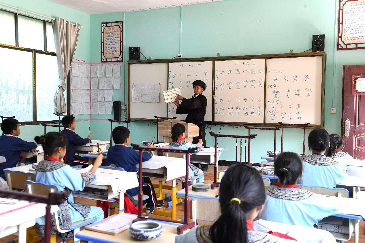 A teacher teaches the Shui script at a school in Rongjiang county, southwest China's Guizhou province. (People's Daily Online/Yang Chengli)