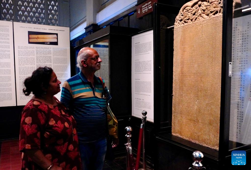 Visitors look at the Trilingual Inscription at the Colombo National Museum in Colombo, Sri Lanka, April 17, 2025. Three documentary heritage collections submitted by China have been inscribed in the UNESCO Memory of the World Register, the United Nations Educational, Scientific and Cultural Organization announced on Thursday. Among the 74 newly added entries, China contributed two solo submissions - the Bianzhong of Marquis Yi of Zeng and the Steles of Shaolin Temple - as well as a joint submission with Sri Lanka: the Trilingual Inscription. (Xinhua/Wu Yue)
