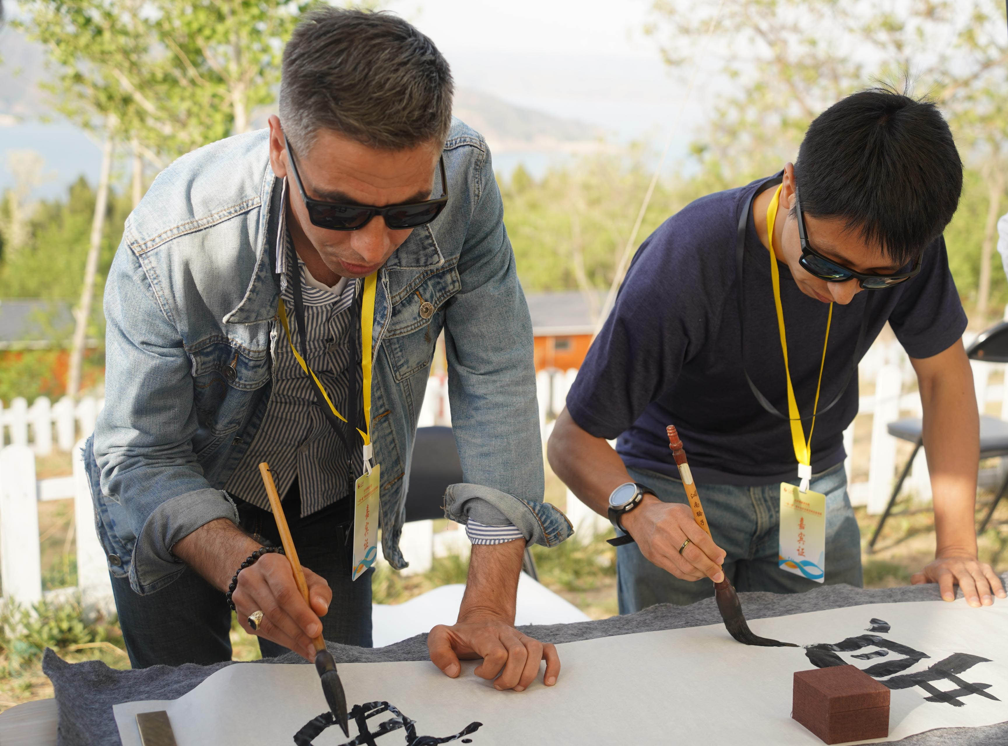 Journalists practice Chinese calligraphy at the Yingzui Mountain campsite in Xin'an county, Luoyang, central China's Henan Province, April 24, 2025. (Photo courtesy of Xin'an county's convergence media center)