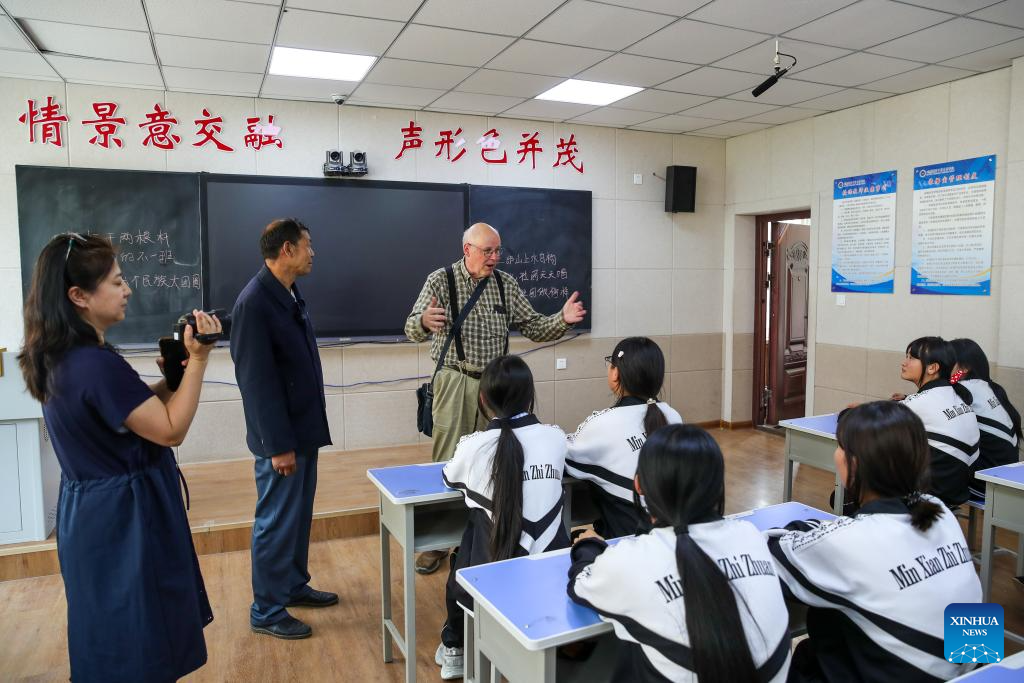 Frank Kouwenhoven shares his views on Hua'er at a vocational secondary specialized school in Minxian County, northwest China's Gansu Province, June 13, 2025. (Xinhua/Lang Bingbing)