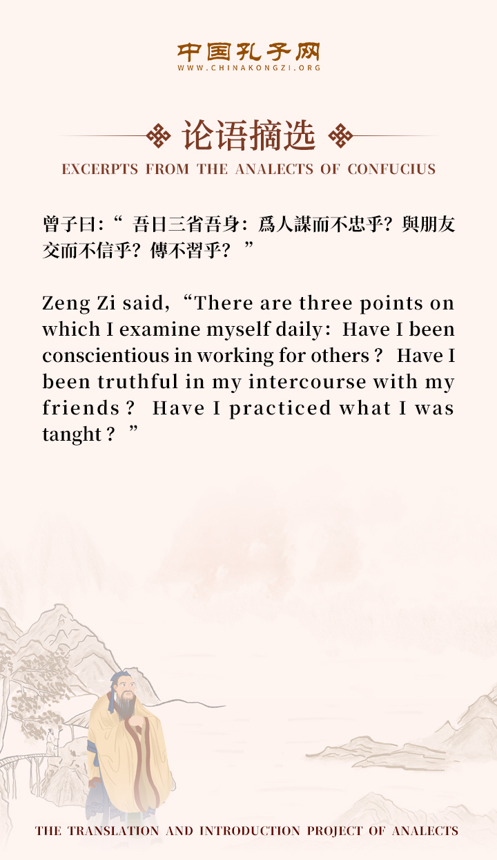 Zeng Zi said,“There are three points on which I examine myself daily: Have I been conscientious in working for others? Have I been truthful in my intercourse with my friends? Have I practiced what I was tanght?”