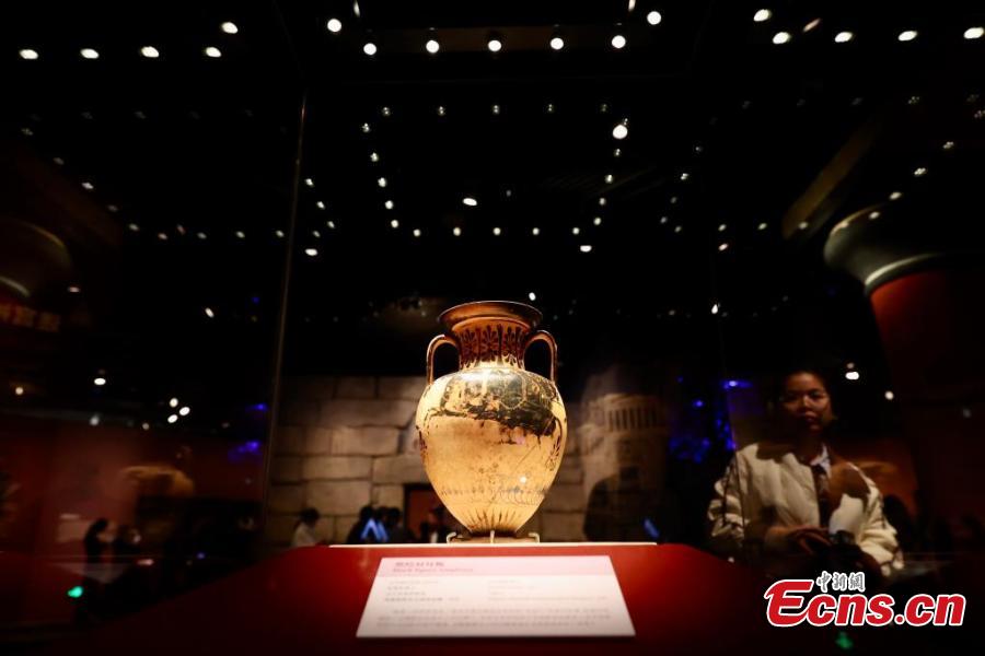 Visitors view an ancient Greek artifact exhibited at the Capital Museum in Beijing, Nov. 20, 2024. (Photo: China News Service/Yi Haifei)
