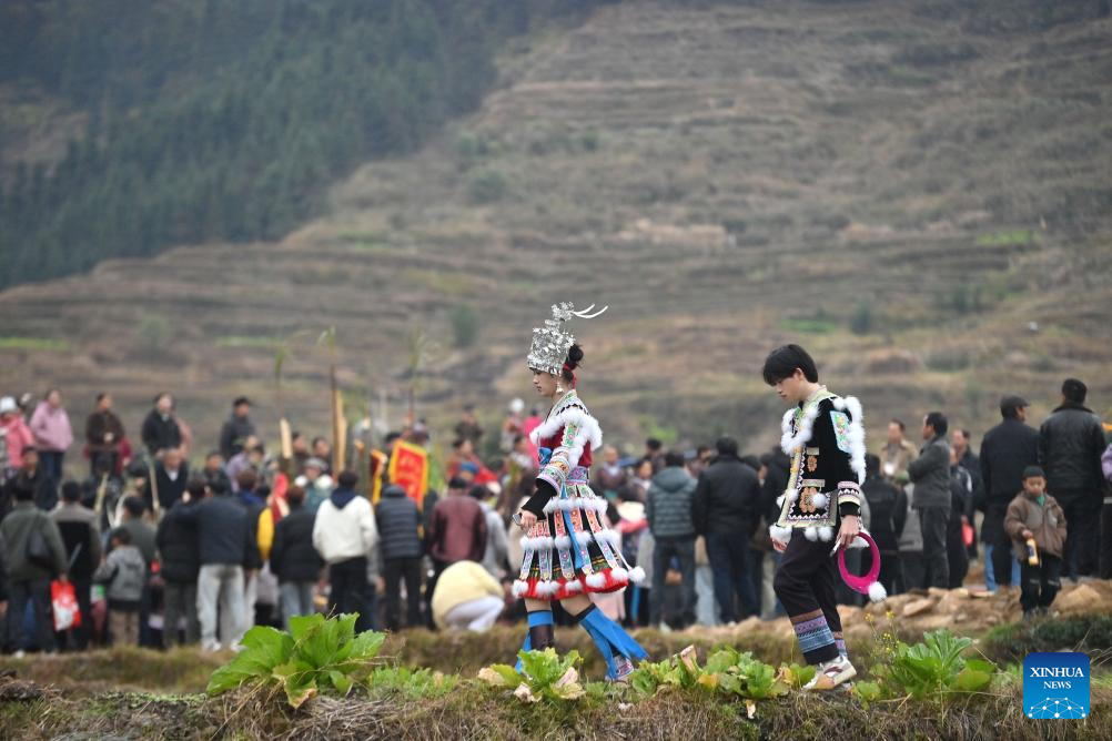 People of Miao ethnic group head towards the venue of "Bainiaoyi" Lusheng festival in Gandong Township, Rongshui Miao Autonomous County of Liuzhou, south China's Guangxi Zhuang Autonomous Region, Feb. 5, 2025. During "Bainiaoyi" Lusheng festival, a traditional festival annually held in Gandong Township, people of different ethnic groups gather together to demonstrate traditional ethnic attire, blow Lusheng, a traditional reed-pipe wind instrument, and perform traditional dancing. (Xinhua/Huang Xiaobang)