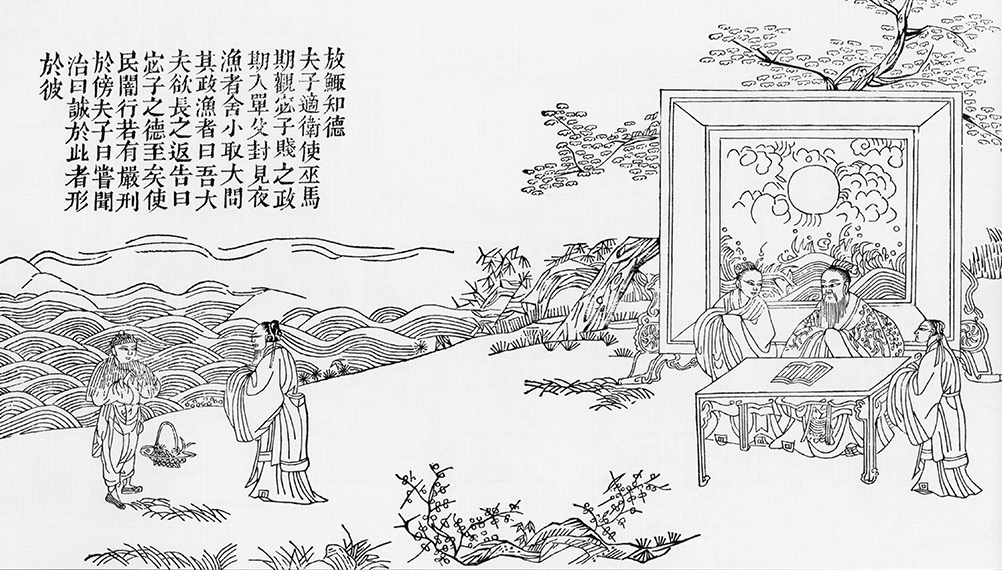 When Confucius went to Wei state, he sent his disciple Wuma Qi to inspect the governance of another disciple Fu Zijian who was the governor of Shanfu County. One night, Wuma Qi saw a fisherman was fishing. He released small fish and kept big fish. Wuma Qi asked about the reason, he said, "Da fu Fu Zijian cautioned us not to catch the small fish until they grow up." Wuma Qi came back and told Confucius, "Fu Zijian is indeed a governor of virtue and the local people act consciously as if under strict supervision."