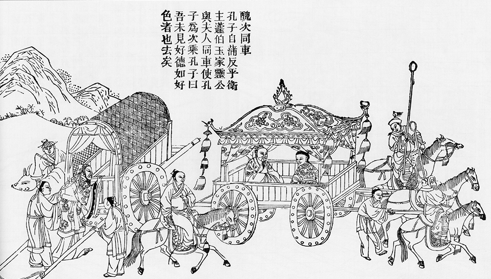 After Confucius visited the duchess of Wei state, he stayed in the capital of Wei for more than a month. One day, Duke Ling of Wei state invited Confucius to go on a tour. But the duke took the same carriage with his wife and let Confucius take the carriage following them. This trip made Confucius feel humiliated and he said, "I have never met a duke who values a man of virtue the same as that of a pretty lady." So he left Wei state again and went to Cao state.