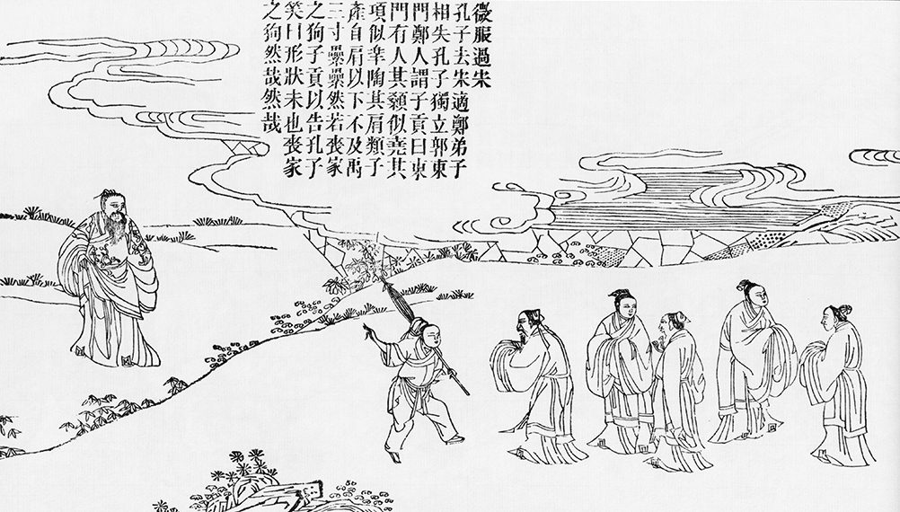When Confucius left Song state for Zheng state, he walked on a different path with his disciples. A few days later, they arrived in Zheng state one after another. Confucius stood alone at the east gate of Zheng's capital, waiting for his disciples. Zigong and some disciples arrived before him but couldn't find him, so they asked people everywhere. A native told Zigong, "There's an old man at the east gate whose forehead like emperor Yao, neck like the legendary sage Gao Yao, shoulder like Zheng's virtuous prime minister Zichan, below the waist like emperor Yu, but thin and tired like a homeless dog." When Zigong find Confucius, he told him about this. Confucius laughed and said, "I feel honored to be described like those ancient emperors and sages, but I pale in comparison with them. Speaking of the homeless dog, that's really what I looked like then."