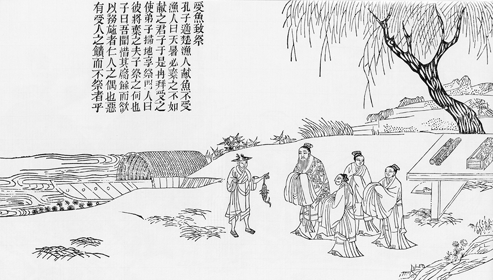 When Confucius came to Chu state, he met a fisherman who wanted to give the newly caught fish to Confucius. Confucius didn't accept it. The fisherman said sincerely, "The weather is so hot and the market is far away. If I can't sell these fish, they will go bad. So, I think it's better to give them to the gentleman." So Confucius took the fish and thanked him again and again. After returning to his residence, he asked his disciples to clean the court immediately and sacrifice the fish to heaven. The disciples were puzzled and asked, "Why do you sacrifice the fish that the fisherman is about to throw away?" Confucius said, "It's benevolent to give food to others for worrying it would go waste. Since I accepted the gift from a benevolent man, why couldn't I use it for sacrifice?"