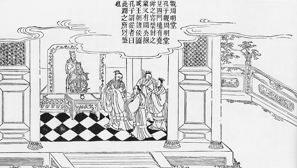 During Confucius' inspection in Luo county (now Luoyang, Henan province), the capital of Zhou dynasty, Confucius visited the imperial ancestral temple of Zhou. The four high walls were painted with the portraits of emperor Yao and Shun, emperor Jie of the Xia dynasty and emperor Zhou of the Shang dynasty, as well as the portrait of Duke Dan of Zhou dynasty holding Duke Cheng meeting feudal princes. Confucius said to his followers, "This is the reason for Zhou dynasty's prosperity."