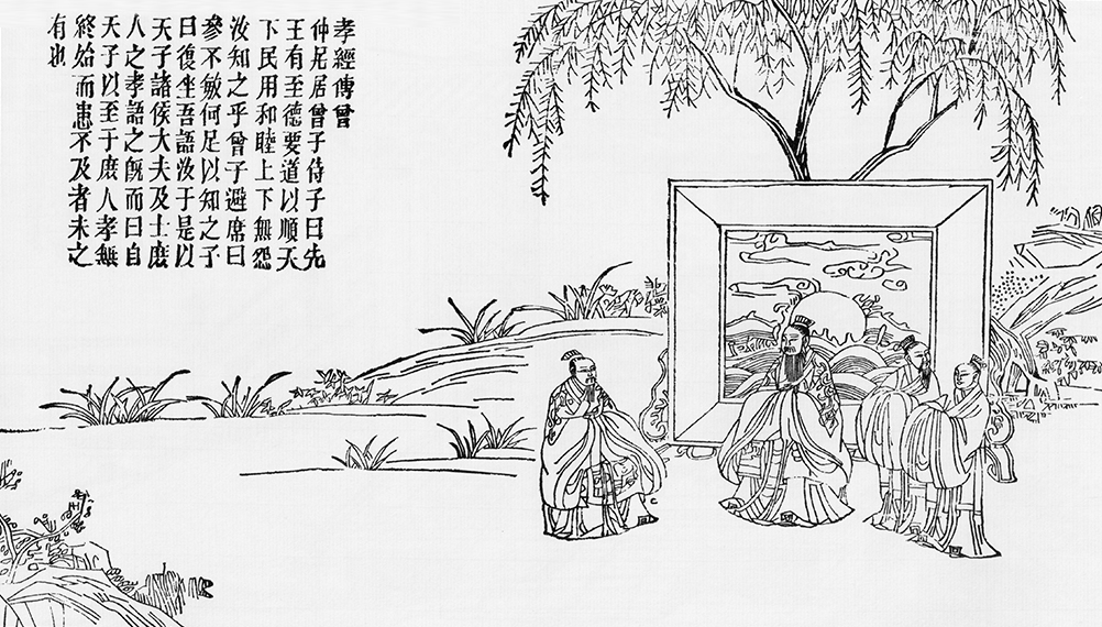 Zeng Zi once sat with Confucius, and Confucius asked him, "Our former monarch governed the state with the highest morality and best method, so that the people lived in harmony, and there was no mutual resentment between officials and the people. Do you know about this?" Zeng Zi stood up and said, "Sir, I'm not smart enough, how can I supposed to know such a profound truth?" Therefore, Confucius told him about how the monarch, the dukes, the ministers and the civilians perform filial piety. And he said, "To people from the monarch to the civilian, filial piety is everywhere, so no one was worried about that they could not perform it."