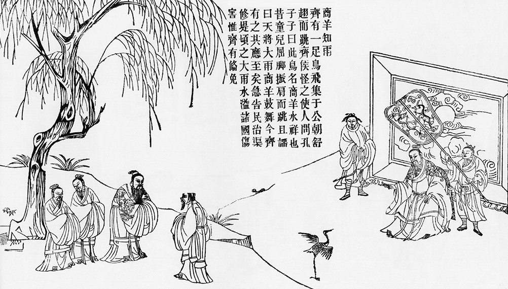 In the summer after Confucius arrived in Qi state, an animal appeared in the pond in front of the palace of Duke Jing of Qi state. Duke Jing felt strange and sent envoys to consult Confucius. Confucius said, "This animal is called Shangyang, which is an omen of heavy rain. As a folk saying goes, ‘It will rain heavily when Shangyang starts dancing.’ Tell the people to regulate ditches and rivers, and to repair dikes, so as to prevent floods this year." Shangyang is actually a crocodile. Crocodiles can forecast the coming of heavy rain and will make a noise like thunder before the rainy season. In the summer of that year, it really rained heavily and caused widespread flooding. Other states were all flooded, but Qi was exempted for being well-prepared. To this, Duke Jing said, "We should believe in what the sage said as it is often verified."