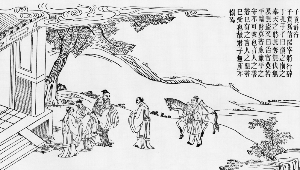Before Zigong went to take office in Xinyang (now in Henan province), he went to say farewell to Confucius. Confucius warned him, "Be diligent and cautious. Guide agricultural production according to the natural change of the seasons. Do not seize or destroy. Do not be cruel or steal. Remember to be fair when rectifying the official style, and be whitehanded and honest when facing with bribery. Honesty and fair should never be changed. Pay attention to your words and deeds. Don't be stingy with your praise to others, and think twice before attacking others."