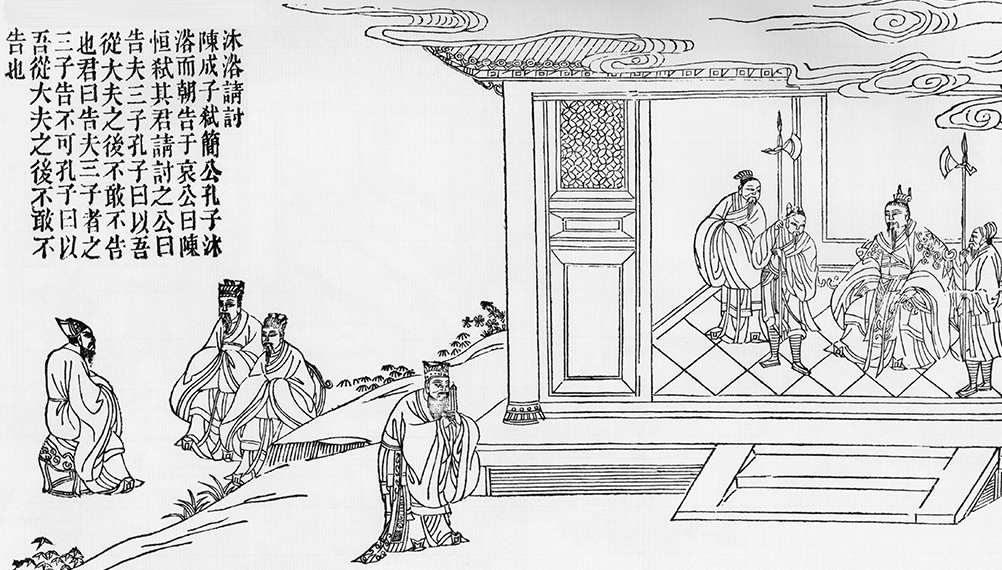 When Confucius learned that Chen Chengzi, a minister of Qi state, murdered Duke Jian of Qi, he quickly had a bath and headed to the court to report it to Duke AI of Lu. He said, "Chen Chengzi killed his monarch, your majesty, please dispatch troops to suppress." Duke Ai said, "Go and report to the three ministers!" After Confucius left the court, he said, "I used to be a minister, so I didn't dare not report. But the duke told me to report to the three ministers!" Confucius then went to visit the three ministers, and they all expressed their disapproval of dispatching troops. Again, Confucius said, "Because I once was a minister, I didn't dare not report." He did not agree with their disapproval, but he could do nothing.