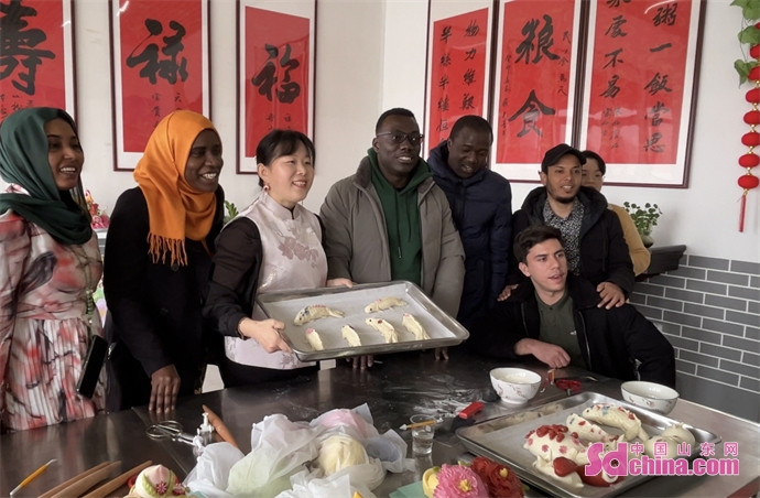 「斉魯職人」「山東省首席技師」の李伝逓さんは留学生たちは牡丹宴を紹介した。牡丹宴は16つの料理があり、花開盛世、牡丹富貴鶏、牡丹桂魚などは留学生が食べていない特色グルメで、留学生たちは写真を撮りながら「綺麗」「美しい」と讃嘆した。