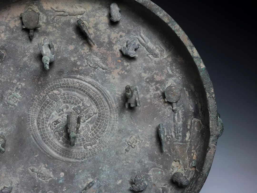 青銅製の晋公盤は洗面器のような道具で、「匜(イ)」と呼ばれる水差しとセットで使用される。匜で水を注ぎ、盤に水を張り、手を差し入れて洗う。晋公盤は中央部分にとぐろを巻く2匹の竜が精緻な浮き彫りでデザインされているほか、鳥や亀、魚、カエルなどさまざま動物の飾りがちりばめられている。なによりユニークなのは、これら19個ある動物の飾りはすべて360度回転させることができる点だ。水を流し込むと、盤上の動物たちは命を吹き込まれたように、水鳥は嘴を開けたり閉じたりし、亀は頭を出したり引っ込めたりし、魚は見えつ隠れつしながら泳いでいるように、カエルは追いかけっこをしているように見え、鳥のさえずりがいつまでも響き渡るように感じる。愛娘がまだ幼かった頃、一緒に池の畔で楽しく遊んだ、そんな美しい思い出の一瞬を再現したような作品となっている。