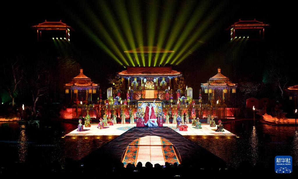 冬の寒空の下、驪山の麓は明るく輝き、西安市臨潼区の華清宮九龍湖で、白居易の長編叙事詩『長恨歌』をもとに創作された同名大型実景歴史舞踊劇の公演が毎晩行われる。山を背景に、水を舞台にした70分間の舞踊劇は歴史物語、舞台演出、音・光・電気を絶妙に融合し、1300年以上前の華清宮での唐玄宗と楊玉環のラブストーリーを芸術で再現し、唐代の繁栄を伝える。